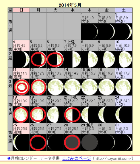 月齢カレンダー(http://koyomi.vis.ne.jp/moonage.htm?cmd=20140509110