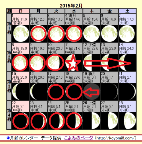 月齢カレンダー(http://koyomi.vis.ne.jp/moonage.htm?cmd=20150209110月齢カレンダー データ提供 http://koyomi8.com/ より)