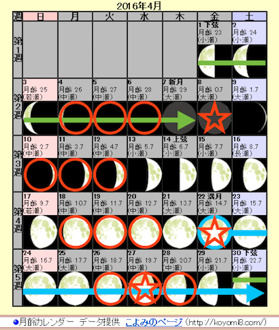 月齢カレンダー(http://koyomi.vis.ne.jp/moonage.htm?cmd=20160509120 月齢カレンダー データ提供 http://koyomi8.com/ より)