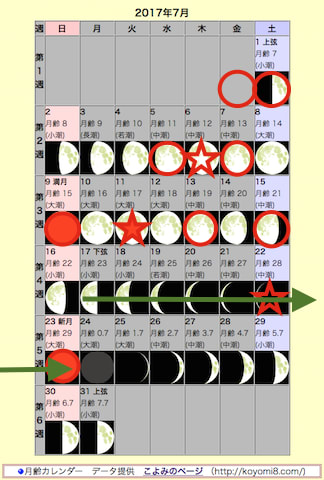 月齢カレンダー(http://koyomi.vis.ne.jp/moonage.htm?cmd=20170709120 月齢カレンダー データ提供 http://koyomi8.com/ より) から考えて見ます。