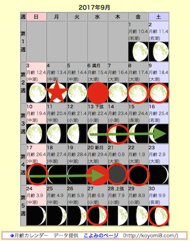月齢カレンダー(http://koyomi.vis.ne.jp/moonage.htm?cmd=20170909120 月齢カレンダー データ引用 http://koyomi8.com/ より) から考えて見ます。