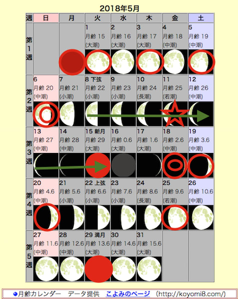 月齢カレンダー(http://koyomi.vis.ne.jp/moonage.htm?cmd=20180509120 月齢カレンダー データ引用 http://koyomi8.com/ より)から考えて見ます。