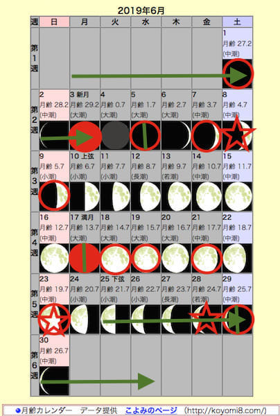 月齢カレンダー( http://koyomi.vis.ne.jp/moonage.htm?cmd=20190709120 月齢カレンダー データ引用 http://koyomi8.com/ より)から考えて見ます。