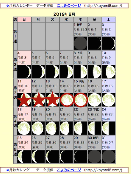 月齢カレンダー( http://koyomi.vis.ne.jp/moonage.htm?cmd=20190809120 月齢カレンダー データ引用 http://koyomi8.com/ より)から考えて見ます。
