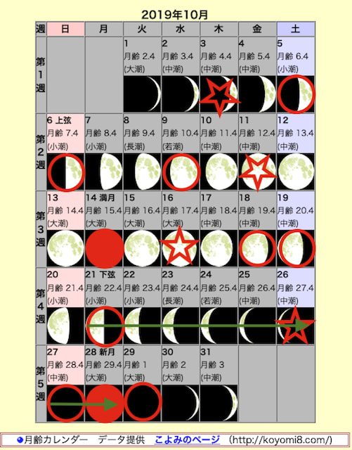 月齢カレンダー(http://koyomi.vis.ne.jp/moonage.htm?cmd=20191009120 月齢カレンダー データ引用 http://koyomi8.com/ より)から考えて見ます。