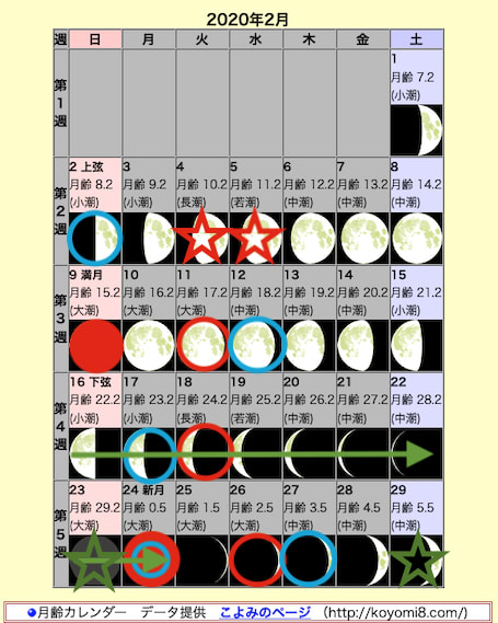 月齢カレンダー(http://koyomi.vis.ne.jp/moonage.htm?cmd=20200309120 月齢カレンダー データ引用 http://koyomi8.com/ より)から考えて見ます。