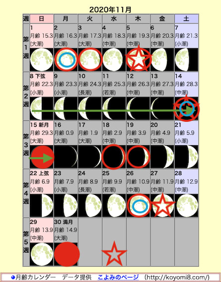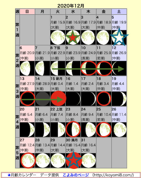 * 月齢カレンダー(http://koyomi.vis.ne.jp/moonage.htm?cmd=20201209120 月齢カレンダー データ引用 http://koyomi8.com/ より)