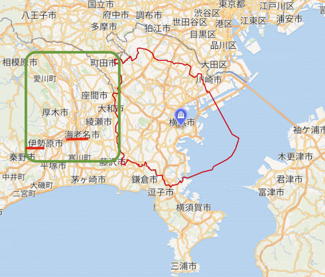 横浜市の大きいことに驚きます。周囲には、こまごまと市や区が密集します。
