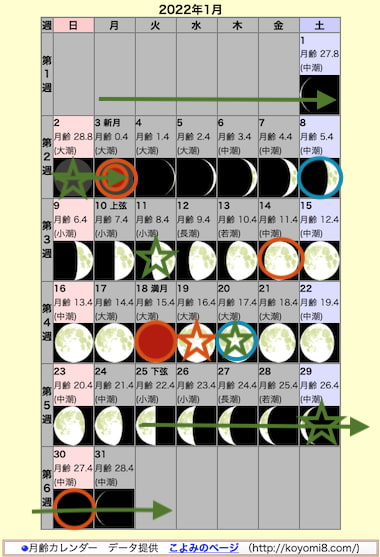 * 月齢カレンダー (http://koyomi.vis.ne.jp/moonage.htm?cmd=20220109120 月齢カレンダー データ引用 http://koyomi8.com/ より)