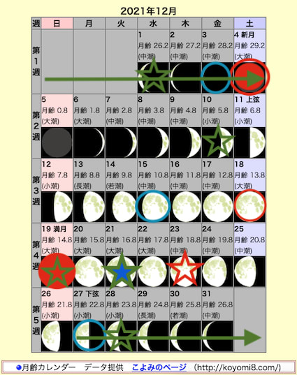 この期間は「新月期間」(カレンダーの緑色線)であり、その1週間は自分の思いが反射されやすい実現週間です。従ってマイナス思考を持つことに注意し、特に良いイメージと軽く希望を思いましょう。感謝の参拝には最適な1週間です。