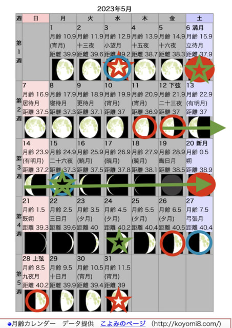 * 月齢カレンダー(http://koyomi8.com/moonage.html?cmd=202305090111 月齢カレンダー データ引用 http://koyomi8.com/ より)