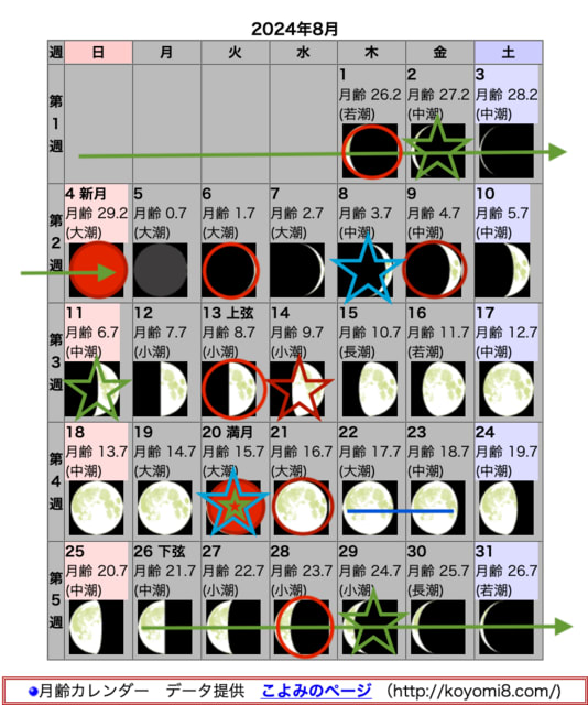 * 月齢カレンダー(https://koyomi8.com/moonage.html?cmd=202408231100X 月齢カレンダー データ引用 http://koyomi8.com/ より)