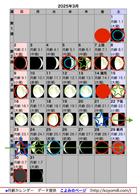 (カレンダーの意味は「2025年3月の自然観察日」を参照)