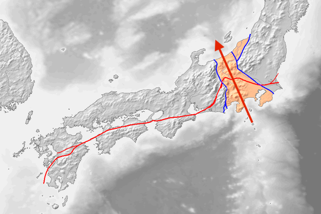 青線に囲まれたオレンジ色の部分はフォッサマグナ、