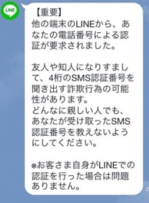 ライン上で家族や親しい友人の名前を騙って、何だかんだという理由で、4桁の認証番号を聞いて来ることも有ります。